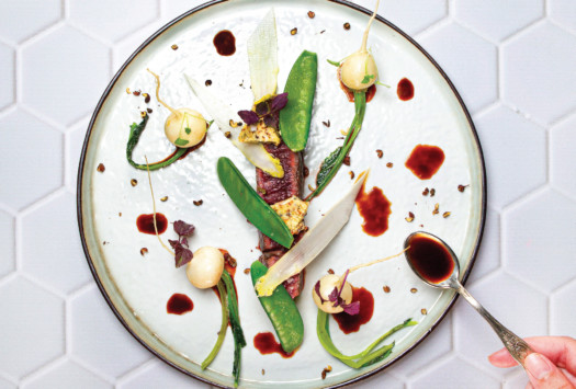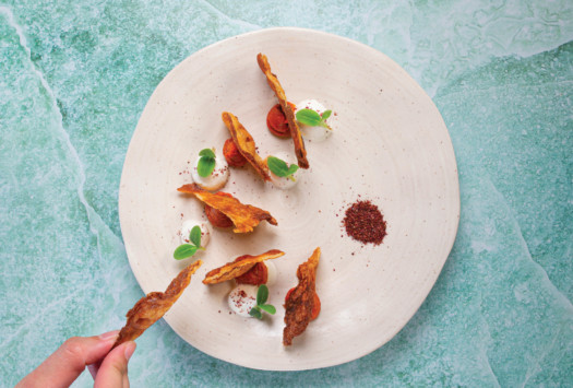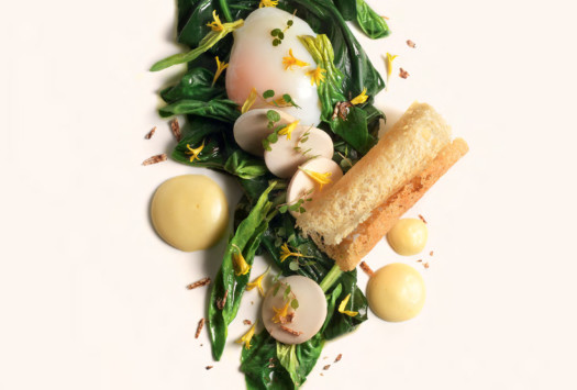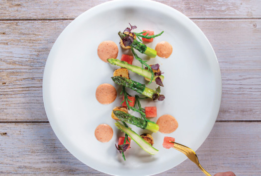 Crème brulée-style bamboo with green asparagus and goji berry béarnaise