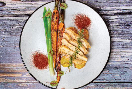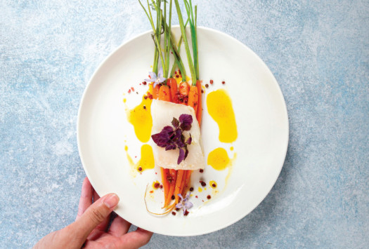 White cod cooked at a low temperature, young carrots glazed with ginger and pink...