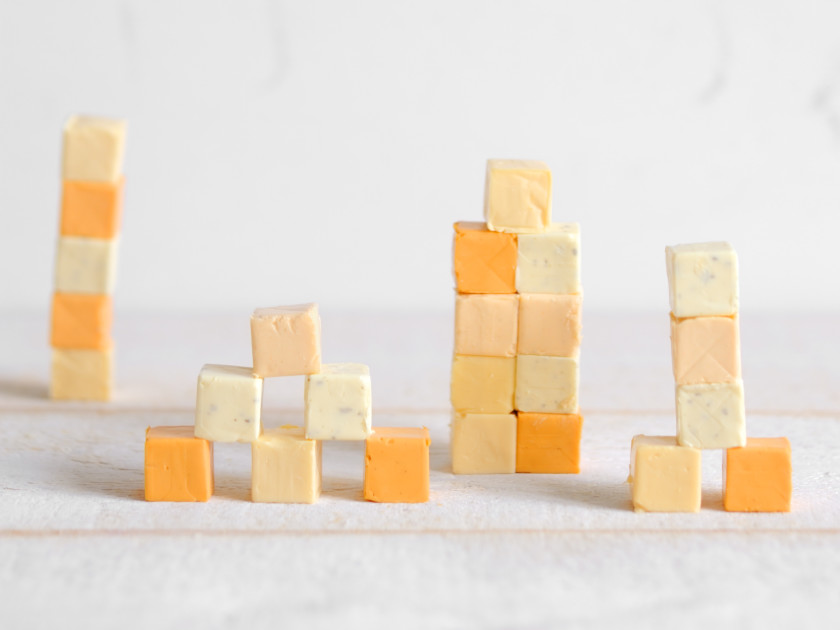 Little cubes of processed cheese of a very smooth and shiny paste of varying colors depending on the flavor, each hermetically wrapped in an aluminum wrapper.