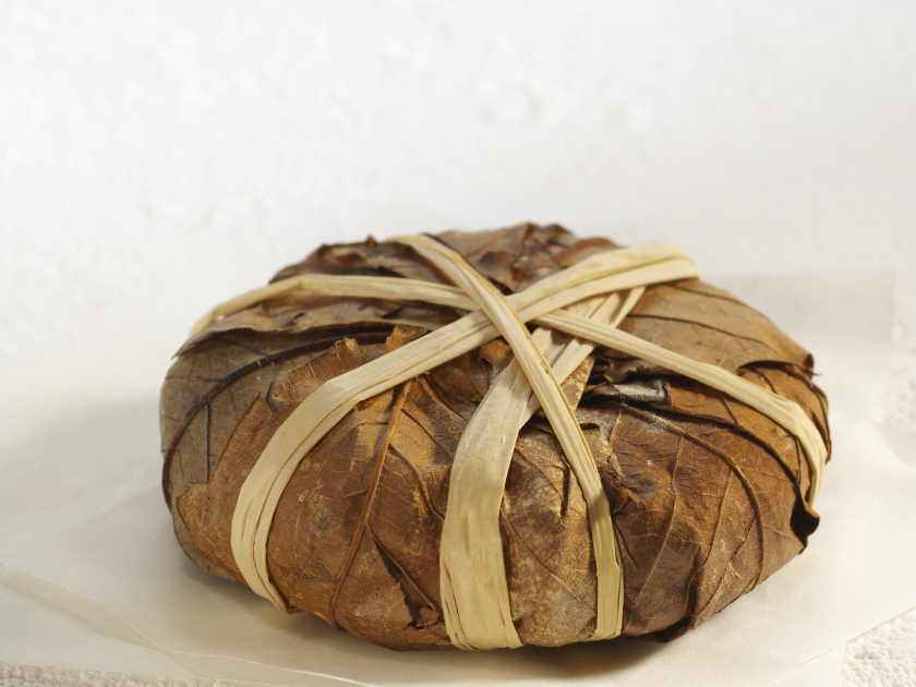 You will find it wrapped in chestnut leaves. Beneath the leaves, its very thin rind is beige with brown spots. Its smooth, shiny paste is very creamy and even runny.