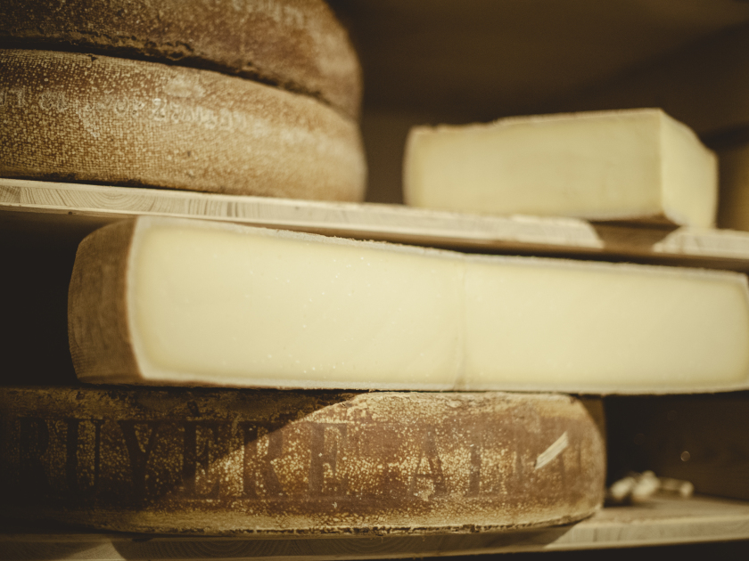 The famous French Gruyère – not to be confused with its Swiss counterpart – has been produced in the Franche Comté and Rhône Alpes regions since the 13th century. The word « Gruyère » is derived from Gruyer officers, an institution of tax collectors founded by Charlemagne; in the territories that would later become France and Switzerland, taxes were sometimes collected in the form of cheeses. Today, near Annecy, there is still a village named « Gruyères »; and there is another in Switzerland named « Gruyère ».