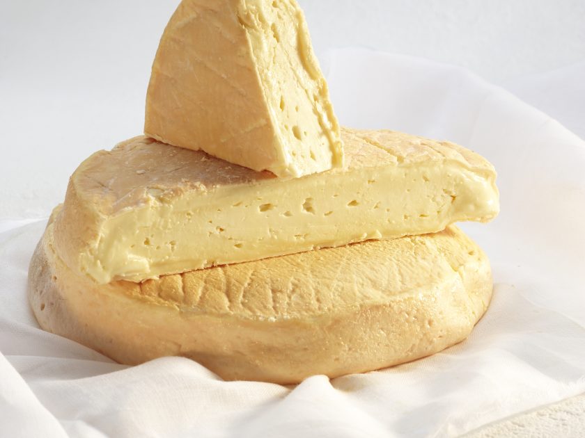 Its orangey-pink rind is thin, smooth and damp. The cheese itself is the colour of cream and often chalky in the middle, or soft and creamy when very ripe.