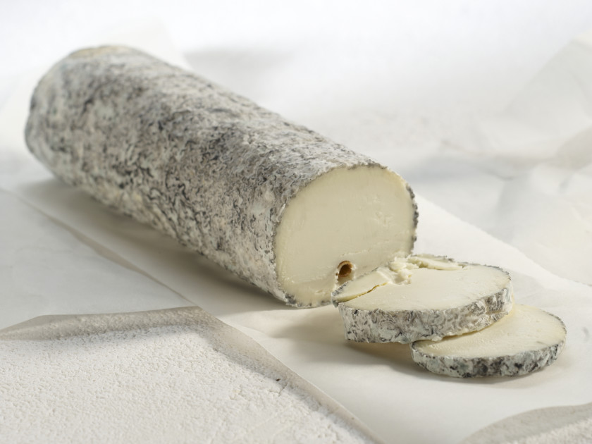 The ashy surface of Sainte Maure de Touraine gradually wrinkles and becomes covered with gray and blue down. The paste reveals a thin creamy layer next to the rind, and remains firm, dense, homogenous and bright white in the center.