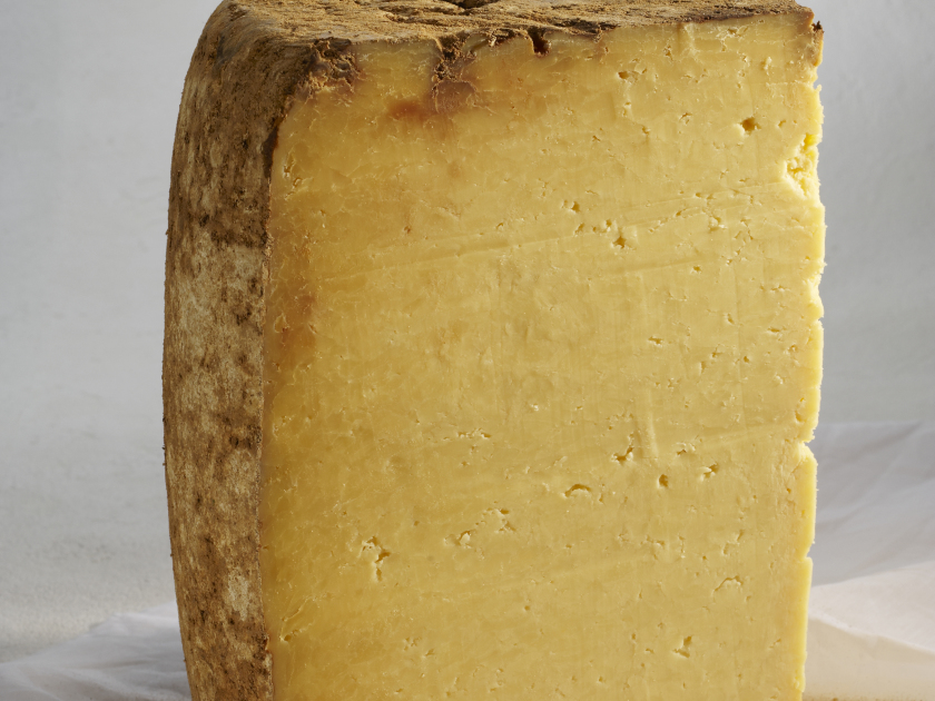 Thick dry rind dotted with gold to brown spots that can become very thick and cracked. The paste is of a mottled yellow color with no holes and a grainy appearance.