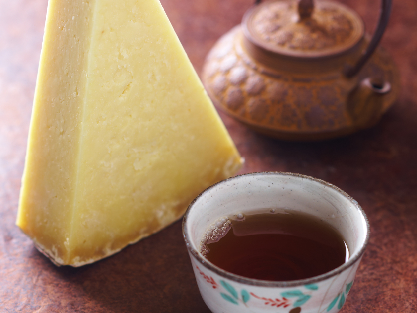 The cheese’s slightly grainy texture, featuring notes of butter and dried fruit, crumbles gently in the mouth when it comes into contact with the hot tea, which displays structured aromas of tobacco and ripe sour fruit. The sweet, minty frosting adds a touch of freshness.