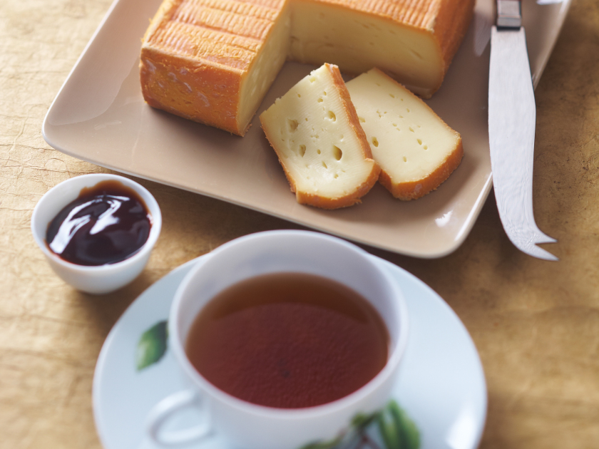 The soft, creamy character of the cheese subtly mixes with the tannins of the tea with their notes of leather, wood and cocoa. The Liege syrup, with its dense, highly aromatic texture and notes of caramelised fruits, enhances the pairing.
