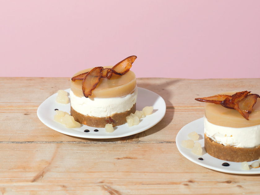 - Arrange the poached pears and fried pear slices on the cheesecake.
