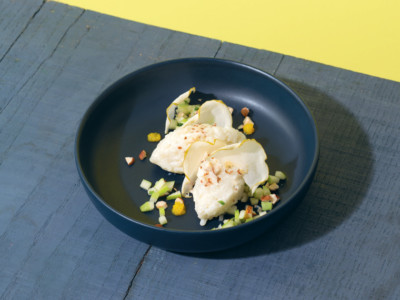 When Sweet Cheese called me, I was thrilled because I love challenges, but it also gave me the chance to work as part of a team. Without a good team behind them, a chef is nothing. We all chipped in, but the pun was my husband’s idea. As a child, my two favourite desserts were crème caramel and rice pudding – although in Mexico we don’t make it with cinnamon like in France, and we add candied fruit or citrus. Mathieu’s play on words gave us the idea of replacing the milk and sugar with Brie. I like all French cheese, but I really love the smooth creaminess of Brie. It coats the rice as it cooks, giving it a lovely sheen. I could have served it in a bowl, just to admire its glossy appearance; but I thought I’d refresh it with apple in three different textures – raw, dried and jellied. Any Mexican would eat this without a second thought!