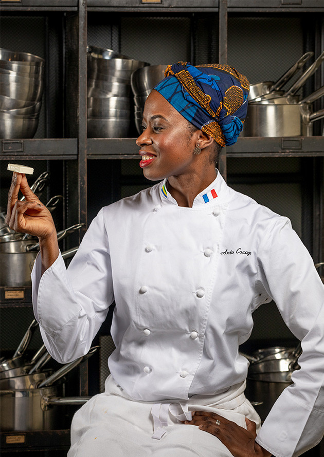Officially, her name is Antompindi Cocagne; but to everyone who knows her, this thirty-year-old mother of a 4-year old son is simply Chef Anto. Anto was born in France and brought up in Gabon, the eldest daughter of an engineer and a nutritionist. After passing her Baccalaureate (in Economics and Social Services), she persuaded her parents to let her return to France to study cookery. She graduated from the Ferrandi school in Paris and found work as a private chef, cooking for individuals, organisations and businesses; she also hosts cookery programmes for Canal+ Afrique.