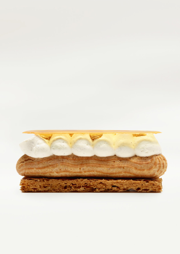 The Saint-Honoré. It presents a beautiful picture, 50% of the volume of the product is plain cream, visible, just piped on top, with a fine layer of caramel that covers it and that’s all.